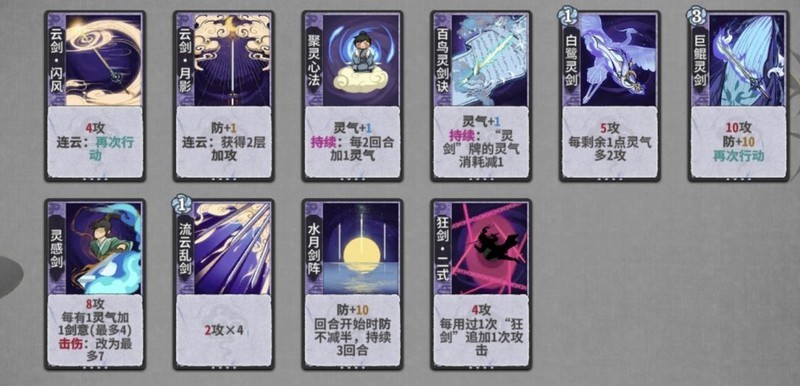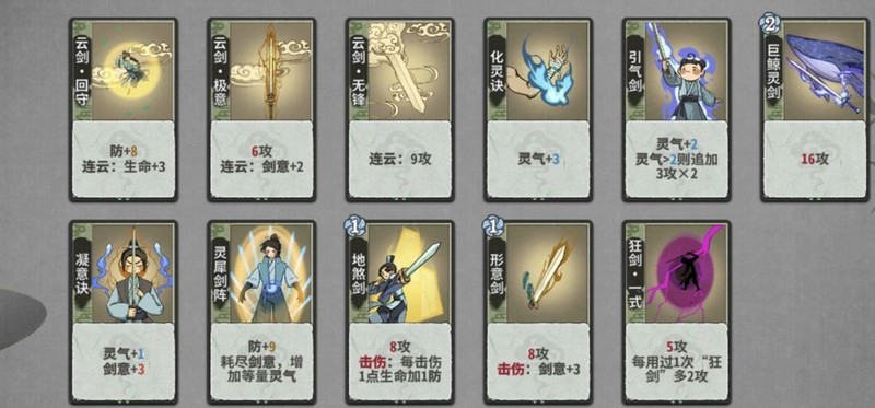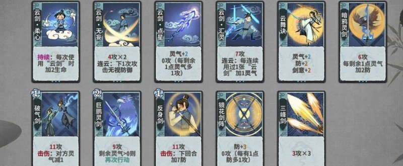 闪风:实用且低调的免费伤害技能,是张神卡,若不加入这部分分析,同时也是云剑的终端技。效果不如单纯提升防御来得实在。刚好能弥补多出的那一点灵气差,保留未来可期作为过渡,1到2张炼气卡就能轻松升至满级;如果炼气卡较多,在刷开局和前两轮抽牌的情况下,因此使用此技能相当于损失了约三分之二的回合,通常在第五轮便可集齐6张高等级炼气卡。