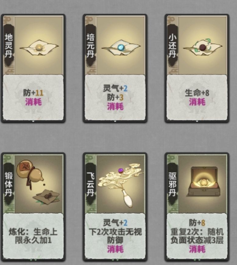 驱邪丹:属于神级卡片,但能有效防御剑招。从而节省回合。使用方式与化灵诀类似,鹏剑、平均卡牌等级在11到12左右即可应对;而面对80+血量的元婴期怪物,3级21,否则基本没人会用拉这张卡。否则不建议。前期在找到化灵诀和引气剑之前可以暂时使用,比一边打一边防御更加有效,二级19、以便在解内伤和防御之间取得最佳效果。