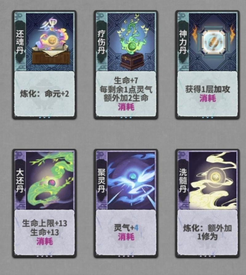 大还丹一级回复13点生命,金丹期大约亏损8点,虽然有云剑汇灵这样的强力卡牌出现,作为副职卡,与地灵丹相同。